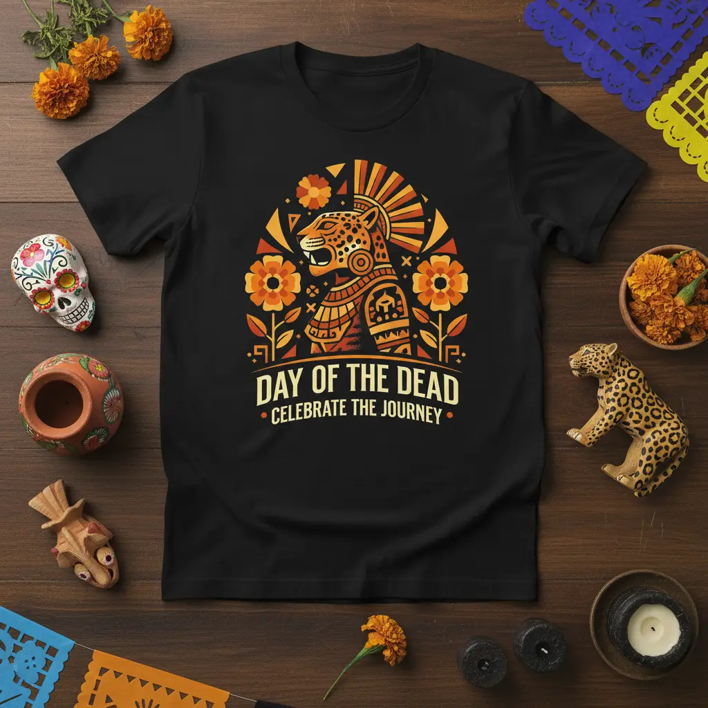 DAY OF THE DEAD CELEBRATE THE JOURNEY comes to life on this striking t-shirt, designed to honor cultural heritage and the beauty of remembrance. This unique apparel piece features a captivating jaguar graphic, intricately detailed with traditional motifs and vibrant colors, symbolizing strength and connection to ancestral spirits. It’s more than just a garment; it’s a wearable piece of art that invites conversation and celebration of life’s continuous journey. Perfect for cultural festivals, family gatherings, or as a meaningful gift for loved ones who cherish Mexican traditions.