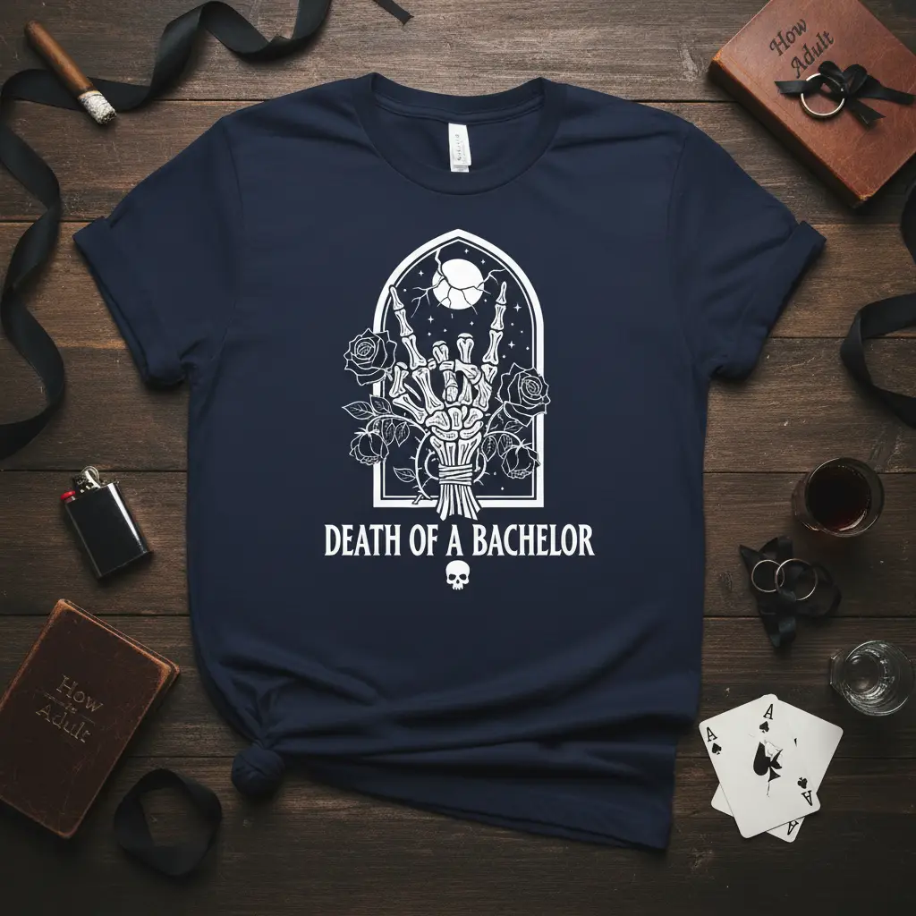 DEATH OF A BACHELOR, this t-shirt is more than just apparel; it’s a statement for the groom-to-be celebrating the end of his single life in style. Featuring a striking graphic of a skeleton hand making the rock-on sign amidst blooming roses and a celestial moon, this design perfectly captures the spirit of transition and celebration. It’s crafted for those who appreciate a touch of dark humor and gothic flair, making it an unforgettable addition to any pre-wedding festivities. This tee ensures the groom stands out, embodying the fun and memorable moments before tying the knot.
