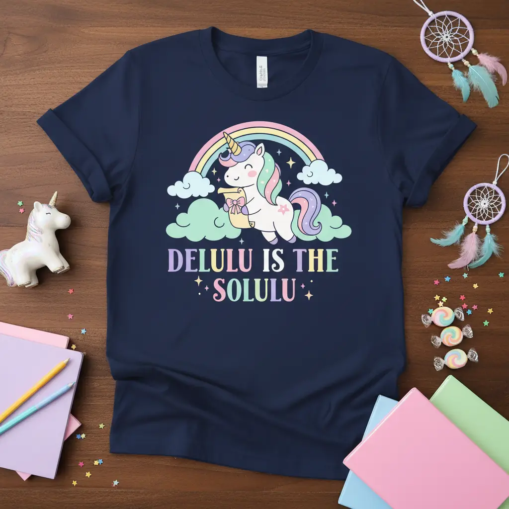This eye-catching tee features the popular phrase “DELULU IS THE SOLULU” in a charming, pastel-colored font. The design is brought to life by a cute, smiling unicorn holding a cup, set against a backdrop of fluffy clouds and a vibrant rainbow. It’s a perfect way to express a lighthearted and optimistic outlook on life.