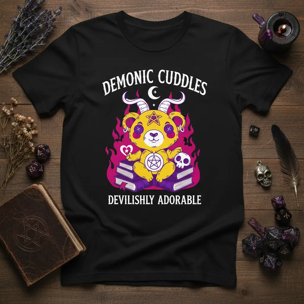 This t-shirt features a captivating graphic of a yellow bear, complete with devilish horns and a prominent pentagram. Flames in vibrant purple and pink hues swirl around the bear, adding an edgy yet playful vibe. The text “DEMONIC CUDDLES” is elegantly written above, and “DEVILISHLY ADORABLE” sits below, perfectly encapsulating the design’s theme. It’s an ideal choice for expressing individuality and a love for gothic or alternative fashion.