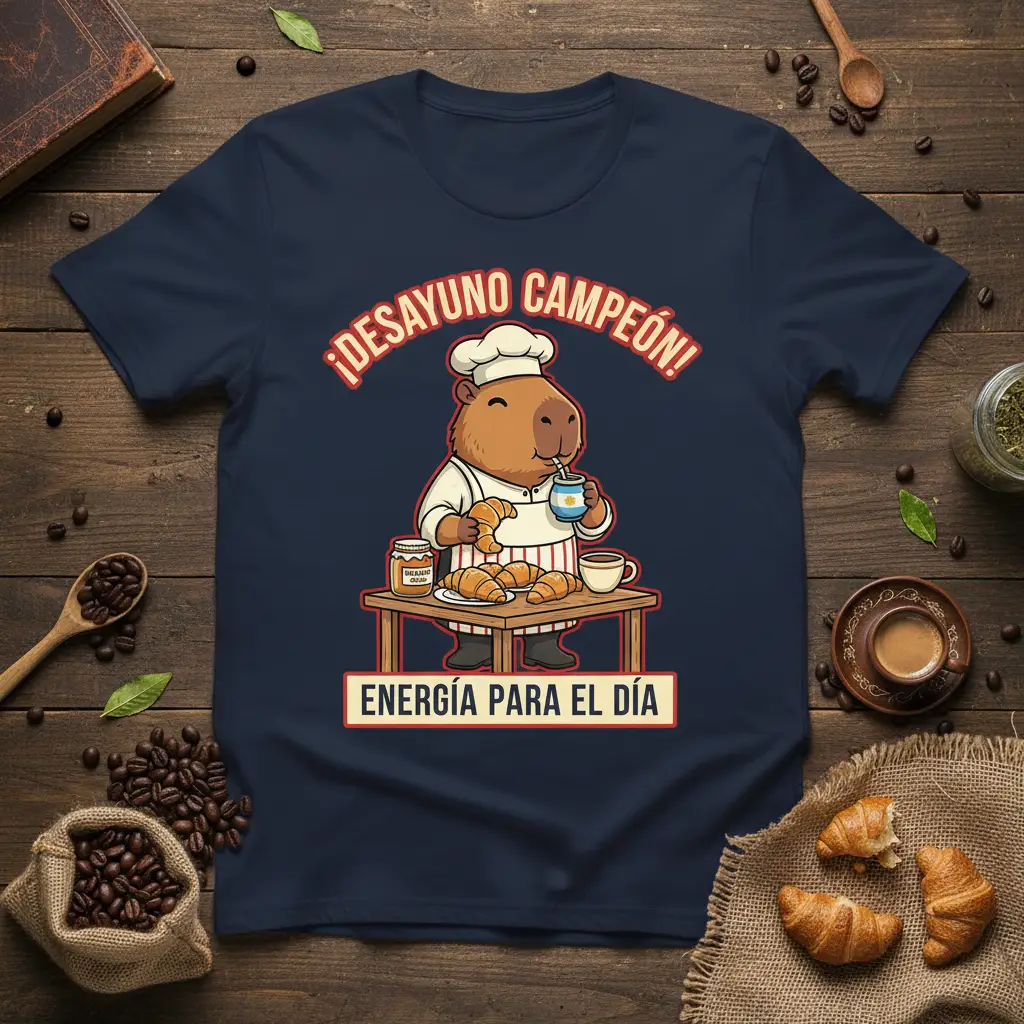 ¡DESAYUNO CAMPEÓN! ENERGÍA PARA EL DÍA is more than just a slogan; it’s a declaration of intent for a day filled with vigor and deliciousness. This t-shirt captures that spirit with a whimsical design featuring a capybara chef indulging in a delightful breakfast spread. The vibrant artwork and catchy Spanish phrases are perfect for anyone who believes that a great breakfast is the key to conquering the day. It’s a conversation starter and a wearable piece of art that celebrates good food and positive energy.