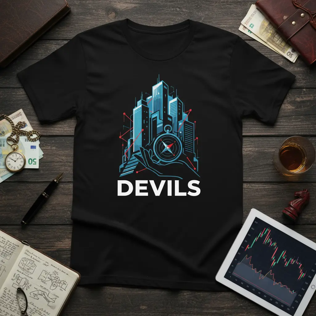 The “DEVILS” graphic tee is designed to capture the essence of urban exploration and strategic thinking. It features a striking visual that merges a stylized, futuristic city skyline with a prominent compass motif. This powerful imagery is perfect for anyone who sees the city as a landscape to be navigated and conquered, symbolizing ambition and a clear sense of direction.