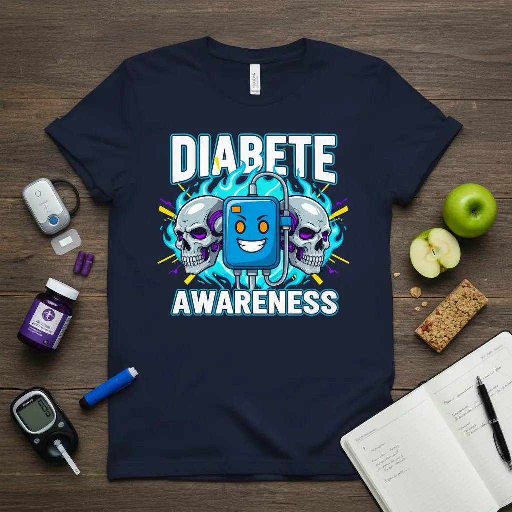 DIABETE AWARENESS is more than just a phrase; it’s a movement, a community, and a personal journey. This t-shirt is designed to represent the strength, resilience, and spirit of those who navigate life with diabetes every day. Featuring an edgy and impactful graphic that combines skulls with a cheerful representation of diabetes management technology, this tee serves as a powerful visual statement. It’s crafted for individuals, their families, and advocates who are dedicated to raising understanding and support for diabetes care and research.