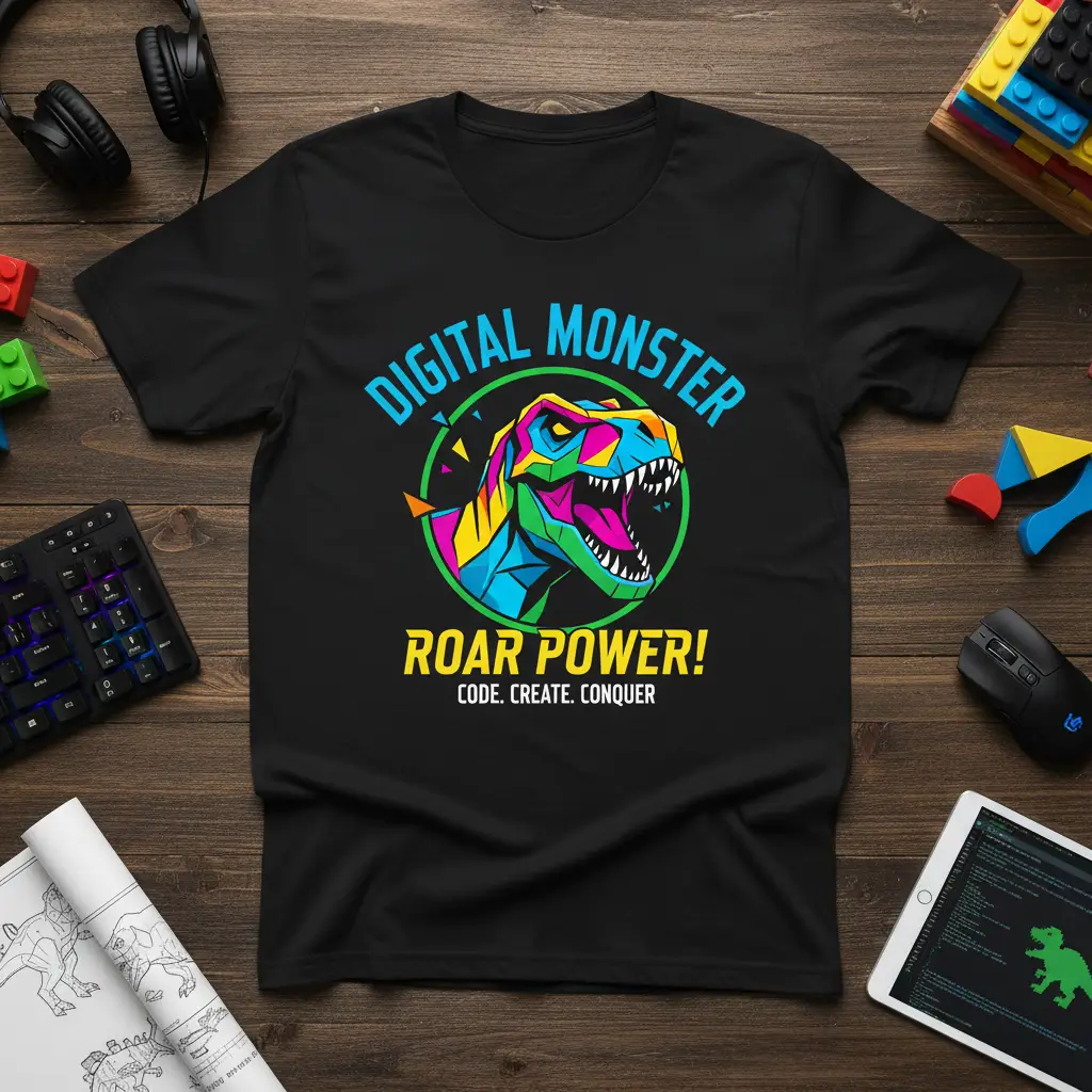 DIGITAL MONSTER ROAR POWER! CODE. CREATE. CONQUER. This dynamic t-shirt is designed for the modern coder, developer, and tech enthusiast who understands the power of innovation. Featuring a bold geometric T-Rex graphic and an inspiring motto, it’s the perfect way to express your passion for the digital world. Wear it with pride as you tackle complex projects and conquer new challenges in the ever-evolving landscape of technology. This shirt isn’t just apparel; it’s a statement of intent for those who build the future.