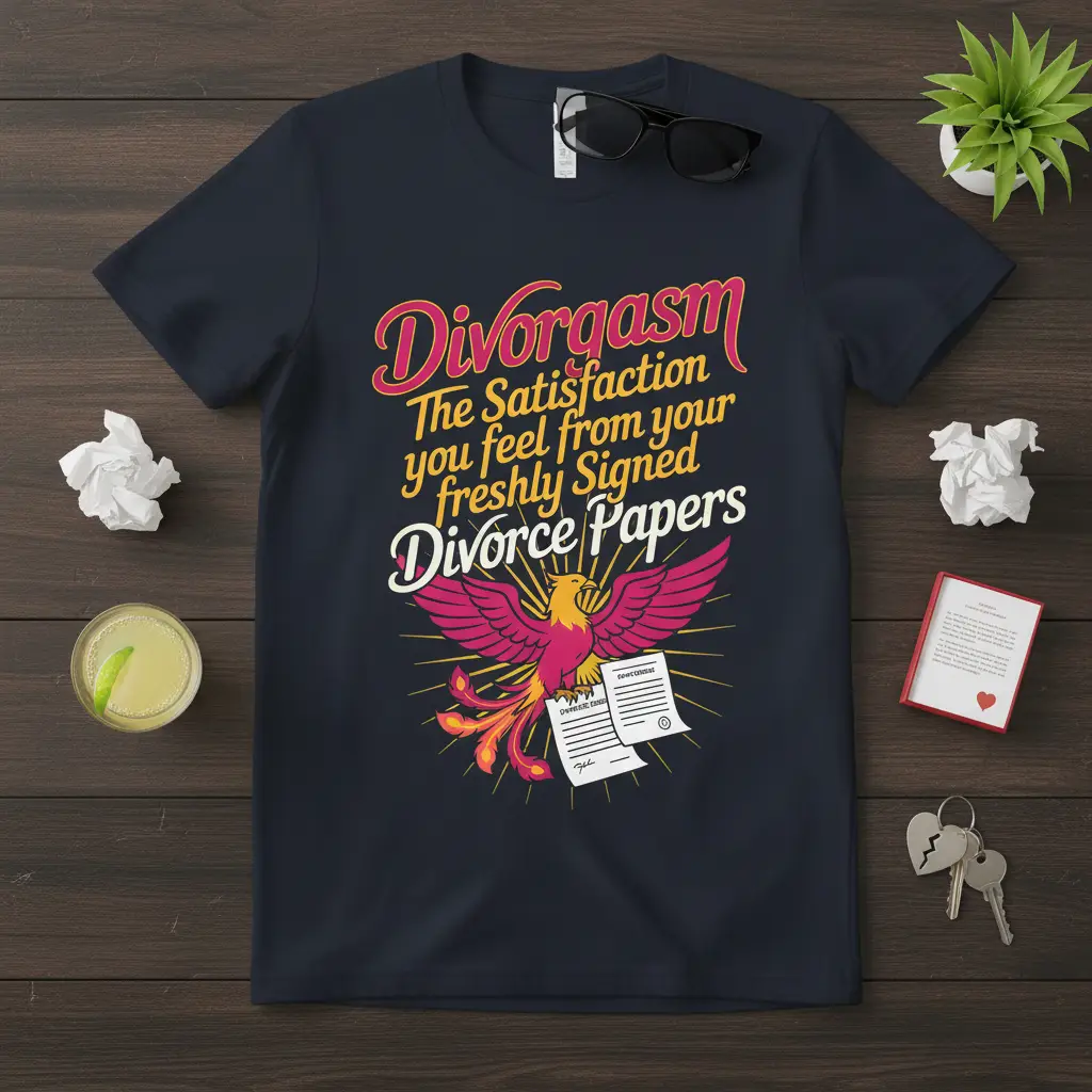 Divorgasm The Satisfaction you feel from your freshly Signed Divorce Papers is more than just a phrase; it’s a declaration of independence and a celebration of a fresh start. This unique t-shirt captures that distinct feeling of relief and empowerment that comes after finalizing a significant life event. Designed for those who appreciate a bit of humor and a lot of symbolism, it’s the perfect way to express your newfound freedom and embrace the next chapter with confidence and a smile. It’s a conversation starter and a statement piece all rolled into one, celebrating resilience and the joy of moving forward.