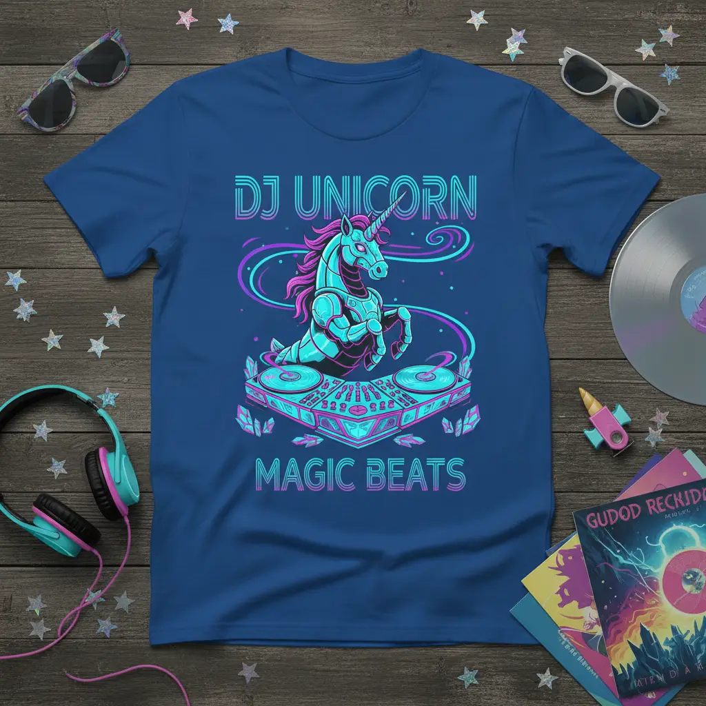 DJ Unicorn Magic Beats come alive with this electrifying t-shirt, designed for those who dance to their own rhythm and believe in the magic of music. This unique graphic tee features a stunning unicorn transforming into a skilled DJ, set against a backdrop of vibrant neon colors and swirling musical notes. It’s more than just apparel; it’s a statement piece that celebrates the fusion of fantasy and electronic beats, perfect for making a memorable impression at any party or festival. Get ready to turn heads and spread good vibes wherever you go with this one-of-a-kind design.