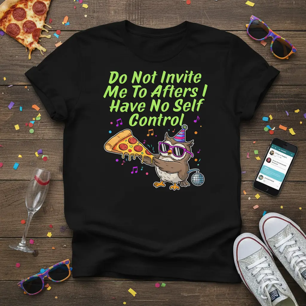 This vibrant tee proudly displays the full quote “Do Not Invite Me To Afters I Have No Self Control” in eye-catching neon green lettering. The design is brought to life by an adorable cartoon owl, complete with cool sunglasses and a festive party hat. This little owl is caught in the act of enjoying a delicious slice of pizza, perfectly embodying the spirit of indulgence and fun.