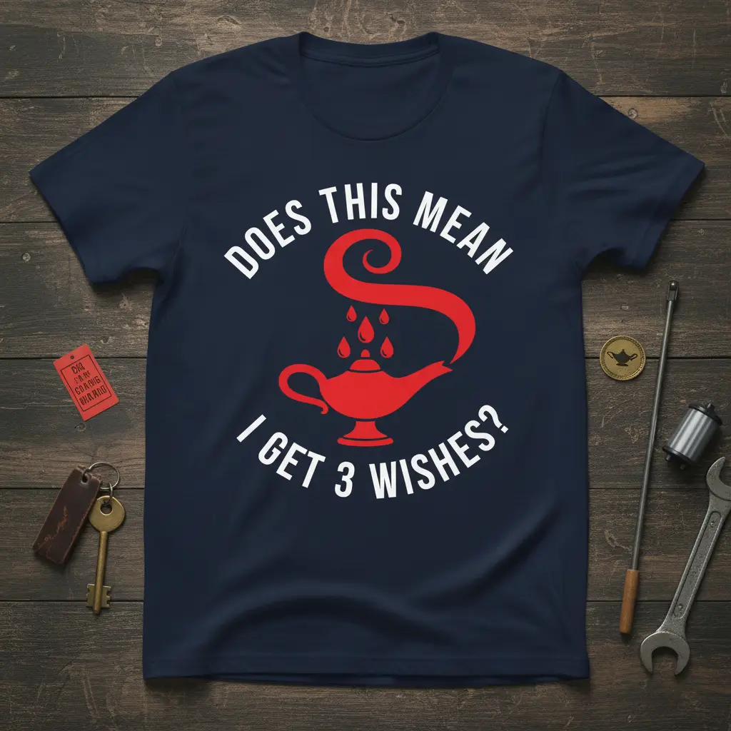 Does This Mean I Get 3 Wishes? This whimsical t-shirt is perfect for anyone who dreams of a little extra magic in their life. Featuring a classic genie lamp design, it’s a fun and playful way to express your fascination with fantasy and mythical creatures. Whether you’re a fan of fairy tales or simply love a good laugh, this tee is sure to become a favorite in your wardrobe. It’s an ideal gift for birthdays, holidays, or just because.