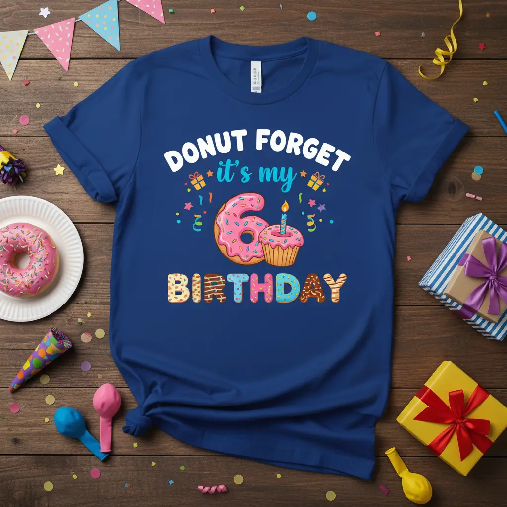 Pick from Black, Navy, Royal, Dark Heather, Red, and White to match your mood and wardrobe staples. Each colorway keeps the Donut Forget It’s My 6 Birthday design clear and photo-ready for everyday wear.