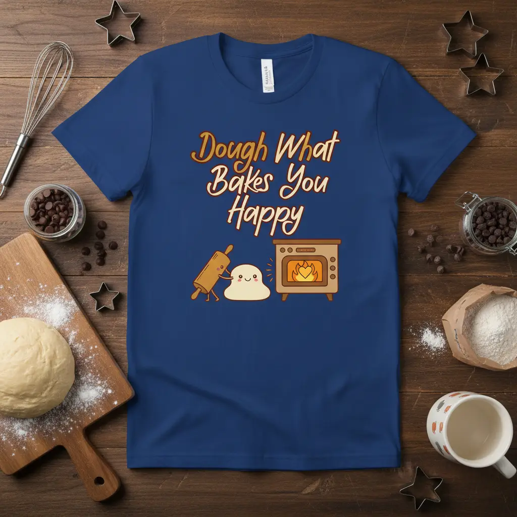 For those who consider baking a hobby, a passion, or even a profession, this t-shirt is a must-have addition to their wardrobe. It’s a conversation starter that connects you with like-minded individuals who understand the unique pleasure of a perfectly risen cake or a batch of golden-brown cookies. This Dough What Bakes You Happy design is not only visually appealing but also carries a message of personal fulfillment and joy derived from a beloved activity. It’s a reminder that sometimes, the simplest things, like working with dough, can bring the most happiness.