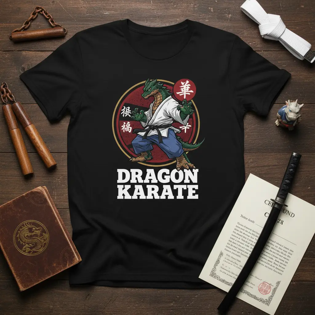 This captivating design features a powerful green dragon, depicted in a dynamic karate stance, ready to strike. The dragon is clad in a traditional white karate gi and blue training pants, symbolizing purity and the journey of self-improvement. Its claws are extended, and its gaze is intense, conveying focus and readiness for action. Surrounding the dragon is a bold red circular emblem, accented with Japanese characters that add an authentic touch of Eastern philosophy and martial arts heritage.