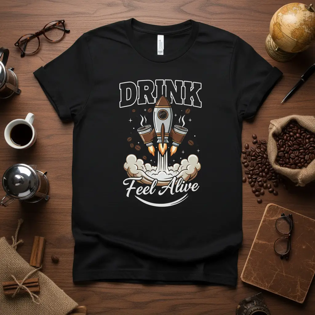 Imagine starting your day with the powerful lift-off depicted on this shirt. The “DRINK Feel Alive” message, paired with the rocket imagery, conveys an immediate sense of energy and ambition. It’s a visual representation of the boost that coffee provides, turning ordinary mornings into extraordinary launches. This tee is designed to resonate with every coffee enthusiast who feels a connection to this energizing ritual.