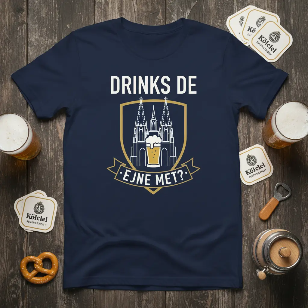 DRINKS DE EJNE MET? This iconic phrase, emblazoned on our premium t-shirt, captures the spirit of camaraderie and good cheer often associated with German culture, particularly in Cologne. The design artfully blends the majestic Cologne Cathedral with a refreshing pint of beer, symbolizing a perfect pairing for any celebration or casual get-together. It’s more than just apparel; it’s a wearable piece of history and a conversation starter for anyone who appreciates the finer things in life, like great beer and stunning architecture. This tee is designed for comfort and style, making it a must-have for locals and tourists alike who want to express their connection to this vibrant city.