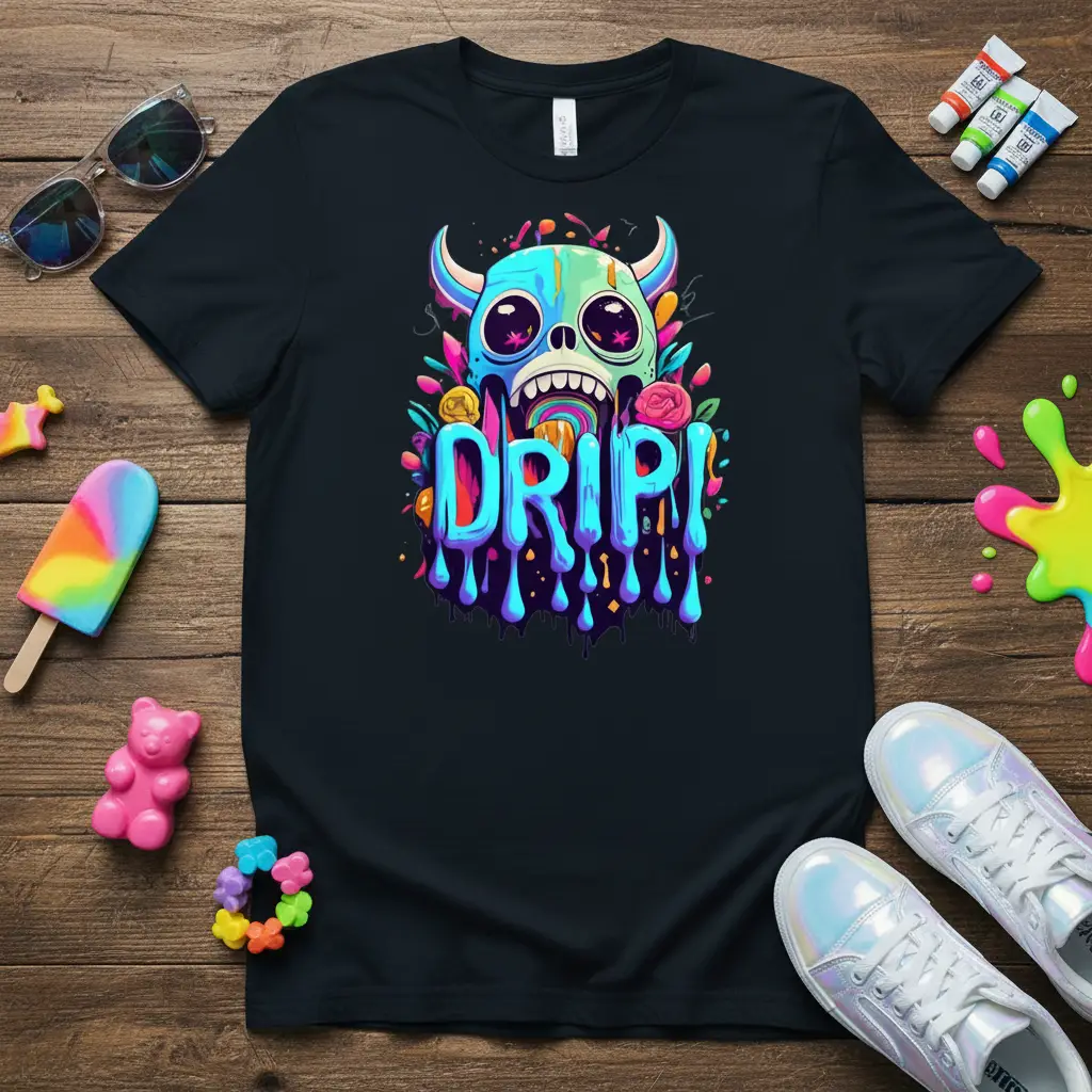 This striking t-shirt showcases the word “DRIP!” in a vibrant, graffiti-inspired font, complete with a dynamic dripping effect that adds a modern edge. The design is further enhanced by a colorful monster skull graphic, complete with horns and expressive eyes, surrounded by abstract shapes and floral elements. This combination creates a visually arresting piece that embodies the spirit of urban fashion and creative expression.