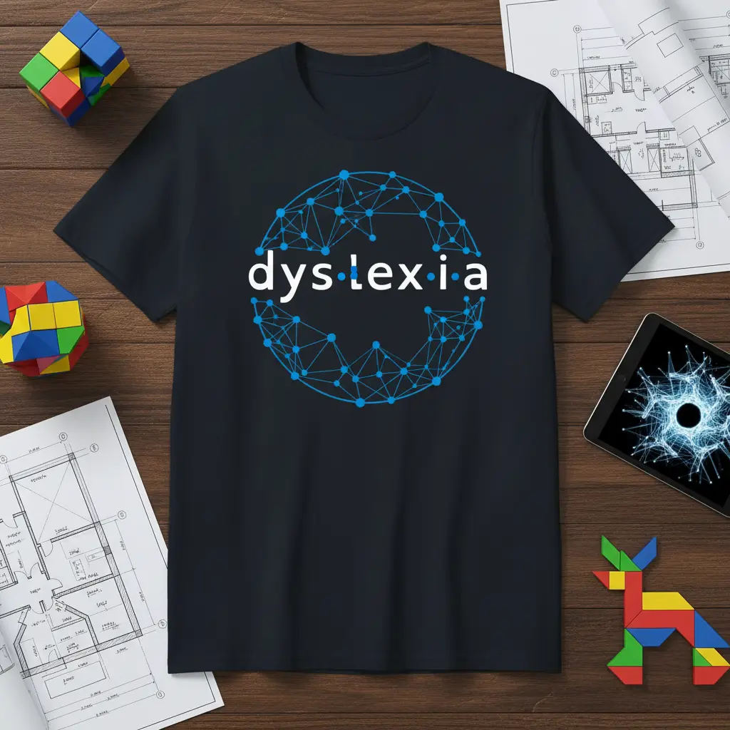 This t-shirt proudly displays the word “dyslexia” within a striking blue geometric network. This visual representation aims to destigmatize learning differences and highlight the complex yet interconnected nature of cognitive processing. By wearing this shirt, you help to spread vital information and encourage a more supportive environment for those affected by dyslexia. It’s an excellent way to advocate for better understanding and resources.