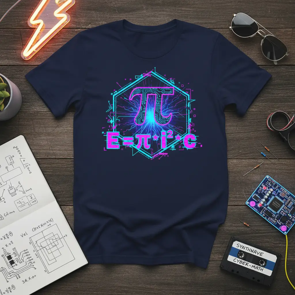 This unique t-shirt prominently displays the equation E=π*I²*C, a fascinating concept that resonates with those who delve into the realms of physics and advanced mathematics. The design is rendered in a captivating neon cyberpunk style, featuring a bright, illuminated Pi symbol at its core. This visual representation is further enhanced by a backdrop of detailed circuit board patterns and sharp geometric lines, evoking a sense of futuristic innovation.