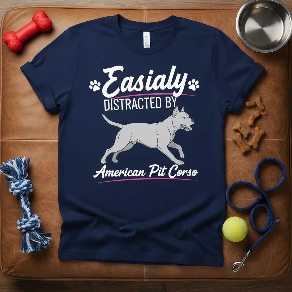 This “Easialy Distracted by American Pit Corso” shirt is more than just fan apparel; it’s a way to express your individuality and your deep affection for your canine companion. The witty slogan combined with the striking graphic creates a look that is both fun and fashionable. Wear it with pride and let the world know about your unwavering devotion to the American Pit Corso breed.