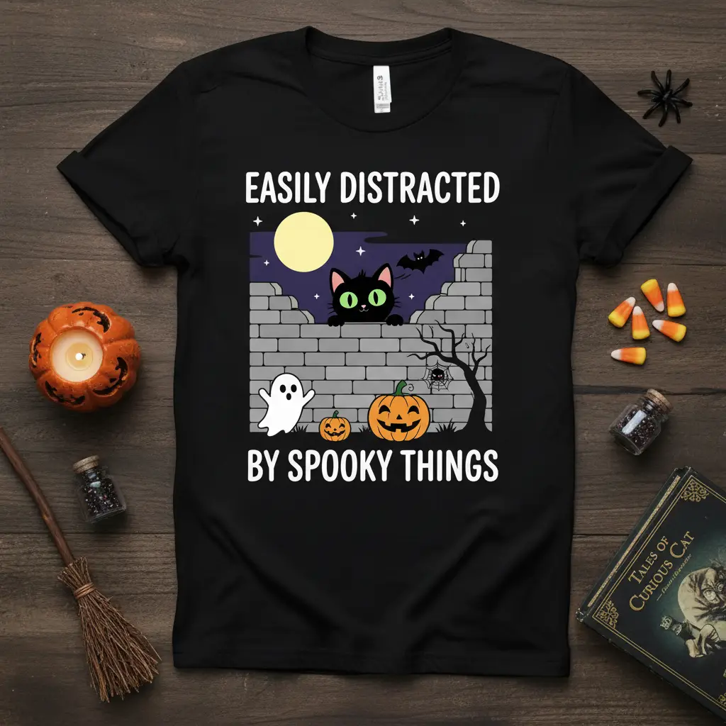 This Easily Distracted By Spooky Things design features a playful black cat, a friendly ghost, a grinning jack-o’-lantern, and a bat silhouetted against a full moon and starry night sky, all set against a textured brick wall. This festive graphic ensures you stand out with a touch of whimsical charm. It makes an unforgettable gift for friends and family who share your passion for the macabre and the magical.