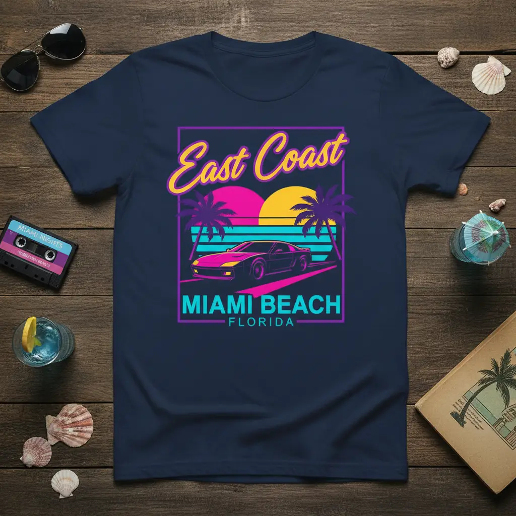 This captivating design showcases the iconic “East Coast MIAMI BEACH FLORIDA” text in a striking, retro font that screams 80s cool. The vibrant color palette, featuring neon pinks, purples, and yellows, perfectly complements the imagery of a stunning sunset over the ocean. Silhouetted palm trees frame the scene, adding to the tropical ambiance, while a sleek sports car cruises along the scenic route, embodying the freedom and excitement of a coastal drive.