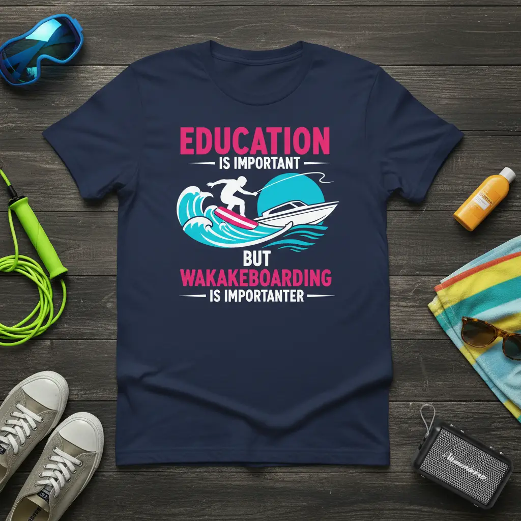Education Is Important But Wakakeboarding Is Importanter. This t-shirt is designed for the true wakeboarding enthusiast who understands that while education has its place, the thrill of riding the waves and the freedom of the open water take precedence. It’s a humorous and relatable statement piece that celebrates a passion for this exciting watersport. Perfect for casual wear, beach days, or showing off your priorities at the next wakeboarding event, this shirt is sure to be a conversation starter among fellow riders and boat enthusiasts.
