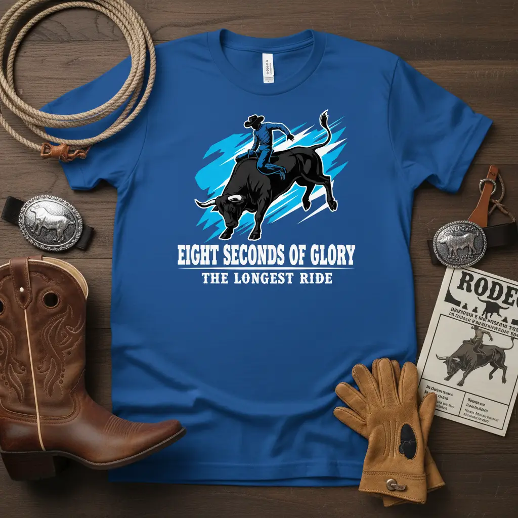 EIGHT SECONDS OF GLORY THE LONGEST RIDE is more than just a phrase; it’s the heart-stopping reality of professional bull riding. This t-shirt captures that intense moment, celebrating the courage, skill, and sheer grit required to stay atop a bucking beast. It’s designed for those who understand the dedication, the adrenaline, and the unparalleled thrill of the rodeo arena. Show your appreciation for this demanding sport with a design that speaks volumes about its most iconic challenge.