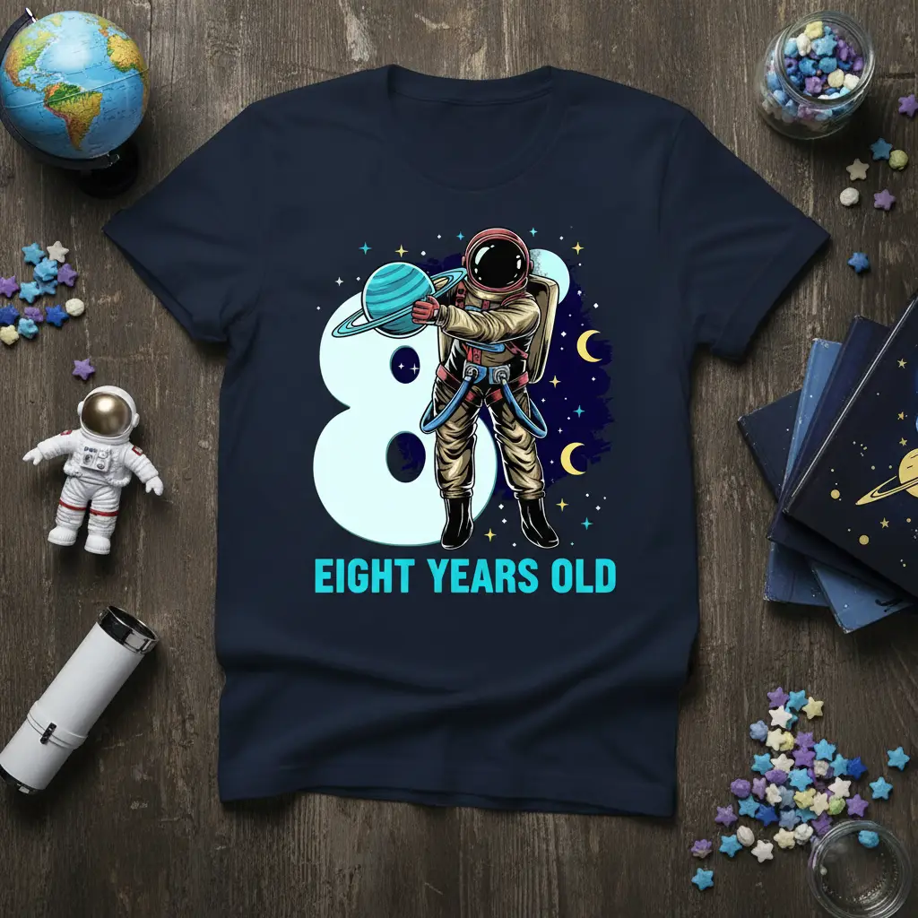 The high-quality print ensures the vivid colors and intricate details of the astronaut and planets remain sharp and appealing, wash after wash. This makes it a durable and long-lasting addition to any child’s wardrobe. It’s a fantastic way to create lasting memories on their special eighth birthday.