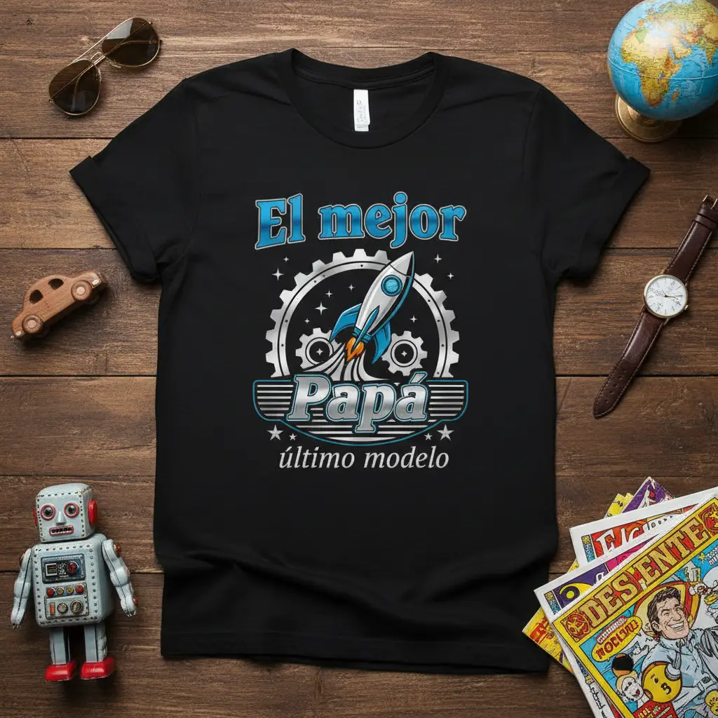The “El mejor Papá último modelo” design is perfect for the dad who is always moving forward, guiding his family with strength and wisdom. The rocket symbolizes his ambition and drive, while the gear represents his steadfast support and the mechanisms that keep everything running smoothly. This shirt is a powerful reminder of his influence and the special place he holds in your life.
