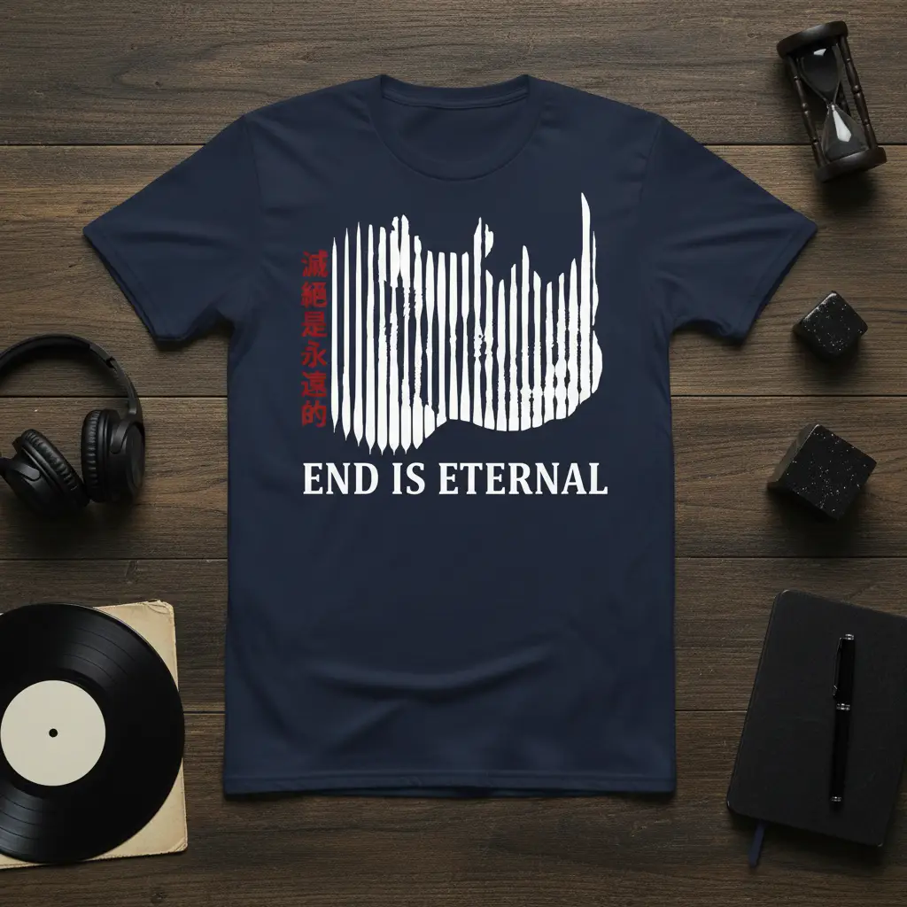 This t-shirt delves into the profound concept of eternity, presenting it through a minimalist and impactful design. The phrase “END IS ETERNAL” invites contemplation on cyclical nature, permanence, and the enduring aspects of existence. It challenges conventional notions of beginnings and endings, suggesting a continuous flow or an unending state. The design’s abstract vertical lines create a visual representation of this continuous motion or an enduring structure.