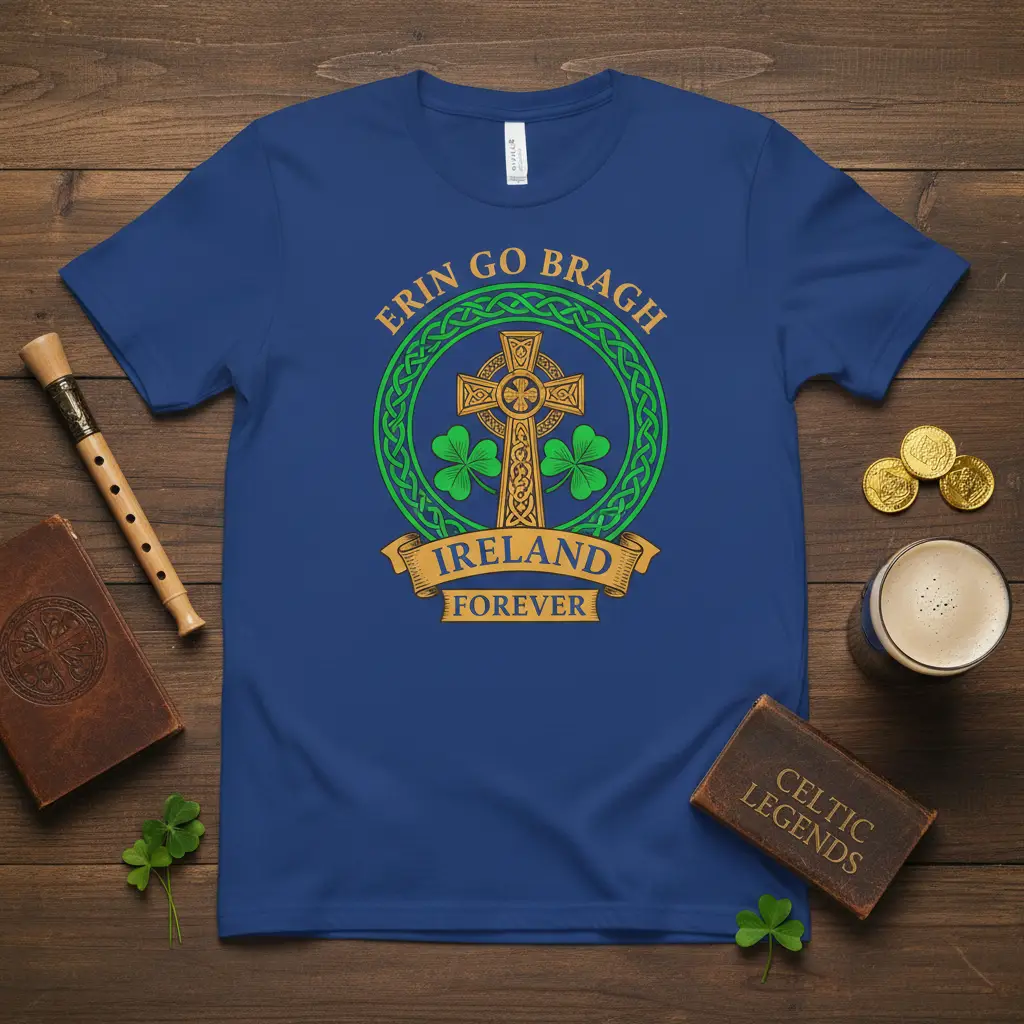 Erin Go Bragh Ireland Forever is more than just a phrase; it’s a powerful declaration of enduring Irish spirit and pride. This t-shirt captures that sentiment with a design that resonates deeply with anyone connected to Ireland’s rich heritage. It’s perfect for celebrating St. Patrick’s Day, attending cultural events, or simply wearing your heart on your sleeve every day. The intricate Celtic knotwork, classic Celtic cross, and vibrant shamrocks combine to create a visually stunning tribute. This shirt is designed to be a cherished piece, symbolizing a lifelong connection to the Emerald Isle.