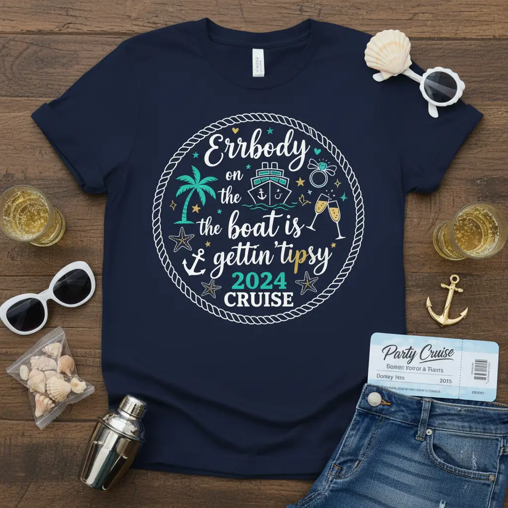 Don’t miss out on the chance to own this fantastic “Errbody on the boat is gettin’ tipsy 2024 CRUISE” t-shirt. It’s the perfect blend of humor, style, and comfort, designed to enhance your cruise experience. Whether you’re buying it for yourself or as a gift, this tee is guaranteed to bring smiles and create a festive atmosphere. Get ready to make waves and memories – order yours today and prepare for an unforgettable journey!