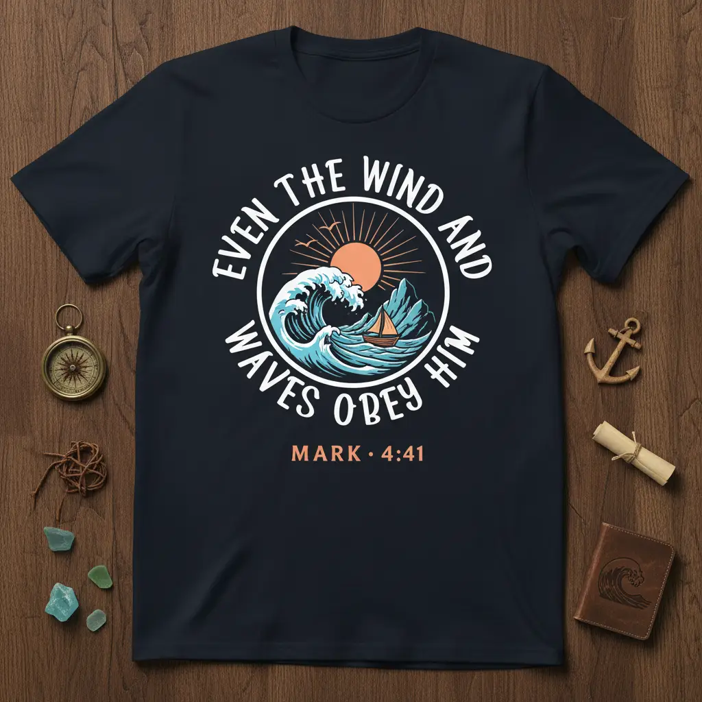 The message “Even The Wind And Waves Obey Him” offers a constant source of encouragement and a visual representation of steadfast faith. It’s a perfect gift for friends, family, or anyone who finds strength and inspiration in spiritual teachings. The blend of artistic design and meaningful scripture creates a truly special garment.