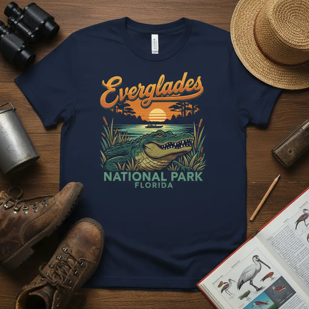 The design prominently showcases a majestic alligator, an iconic symbol of the Everglades, rendered with impressive detail. Set against a backdrop of a serene sunset over the water, complete with silhouetted palm trees and a distant boat, the scene evokes the tranquil yet wild atmosphere of the park. The bold typography proudly declares “Everglades NATIONAL PARK FLORIDA,” making it clear this shirt is a tribute to this extraordinary place. It’s more than just apparel; it’s a wearable postcard from one of America’s most unique natural treasures, perfect for sparking conversations about conservation and the beauty of the wild.