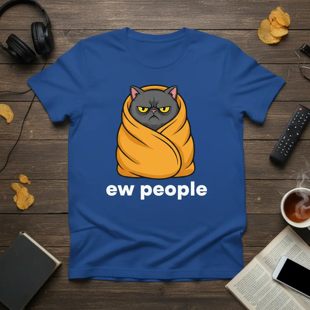 The “Ew People” design taps into a universally understood feeling of wanting to retreat from the hustle and bustle of social life. It’s a fun, lighthearted way to express that sometimes, a cat and a blanket are all the company you need. This tee is a must-have for anyone who identifies with the sentiment and wants to wear their introverted badge with pride and humor.