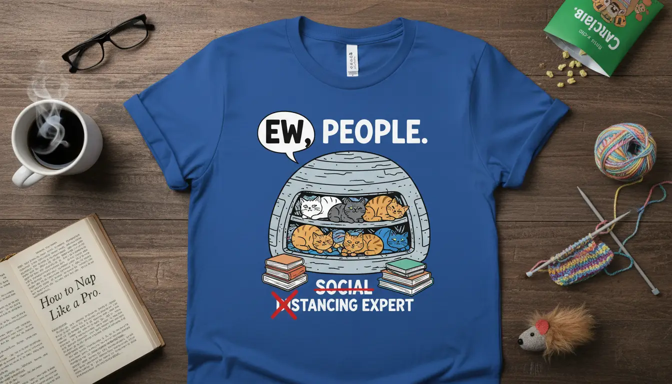 Embrace your inner hermit with the “Ew, People. Social Distancing Expert” t-shirt, featuring a cozy huddle of cats. This humorous tee is perfect for anyone who prefers feline companionship over social gatherings. Made with comfortable, high-quality fabric, it’s an ideal gift for the cat lover or introvert in your life.