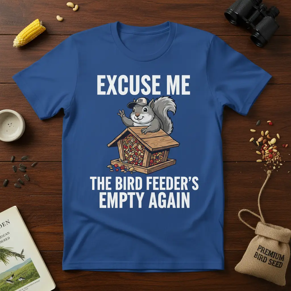 Excuse Me The Bird Feeder’s Empty Again, this humorous and relatable phrase is printed boldly on this comfortable t-shirt, perfect for anyone who adores squirrels and enjoys the simple pleasures of backyard bird watching. The design features an adorable cartoon squirrel, complete with a tiny baseball cap, peeking out from a well-stocked bird feeder. This graphic tee is more than just apparel; it’s a conversation starter and a declaration of your appreciation for nature’s most persistent little visitors. It’s a perfect way to express your love for wildlife and a touch of garden humor.