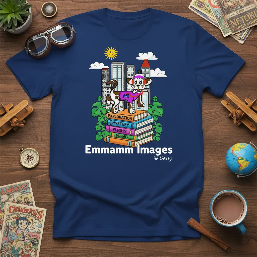 EXPLORATION MYSTERY FLIGHTY FLIGHT comes to life on this captivating t-shirt, designed for those who cherish the thrill of discovery and the comfort of a good book. This unique graphic tee features an adorable dog standing proudly on a stack of books, each bearing a title that whispers tales of adventure. The whimsical city skyline in the background further enhances the theme of exploration, making this shirt a perfect statement piece for readers, dog lovers, and dreamers alike. Embrace your inner adventurer and wear your love for stories proudly.