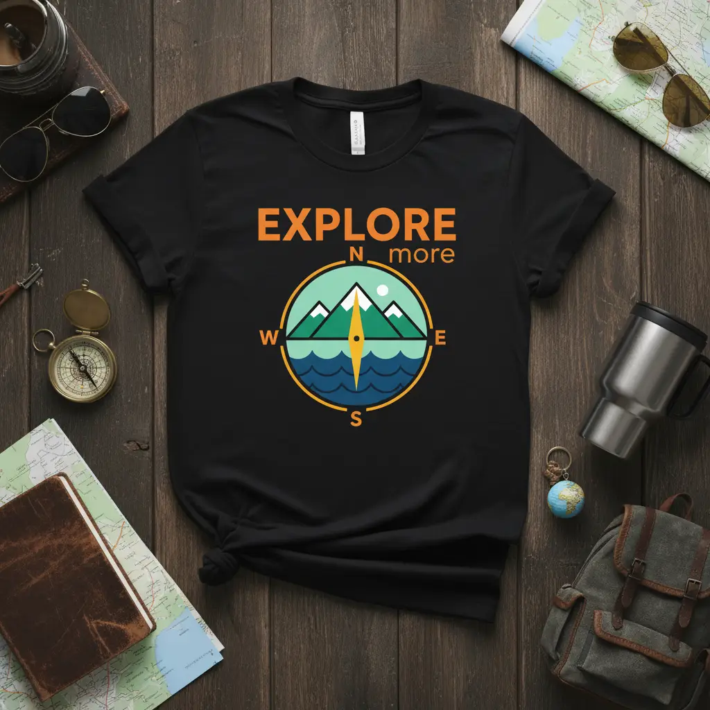 This unique t-shirt celebrates the adventurous soul, featuring the inspiring phrase “EXPLORE N more” prominently displayed. The accompanying circular graphic artfully depicts a serene landscape with mountains meeting the sea, a kayak ready to set sail, and the cardinal directions of a compass. It’s a visual representation of the wanderlust that drives us to seek out the world’s wonders.