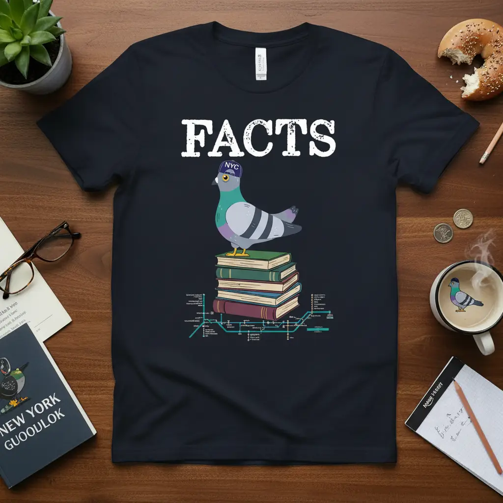 Don’t miss out on this unique and engaging design that celebrates intelligence, urban life, and the charm of the city pigeon. Whether you’re a trivia master, a subway navigator, or simply someone who enjoys a clever graphic tee, this “FACTS” shirt is sure to become a favorite. Add this distinctive piece to your collection and let your love for knowledge shine. Order yours today and start spreading those facts in style!