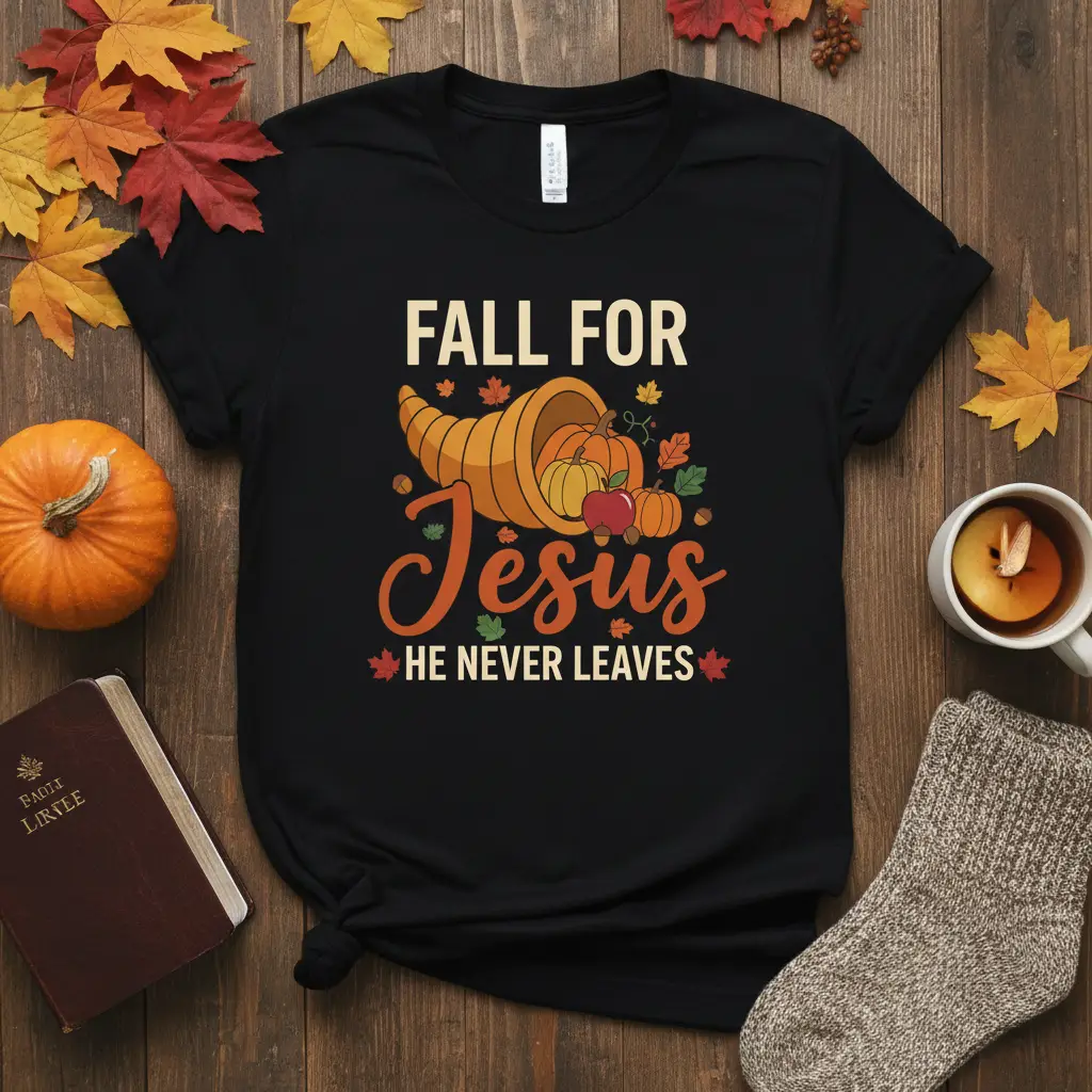 This unique t-shirt is designed for those who wish to express their deep faith and appreciation for the blessings of autumn. The phrase “Fall For Jesus” combined with “He Never Leaves” creates a powerful message of enduring belief and commitment. Its vibrant design features a festive cornucopia filled with pumpkins and autumn leaves, symbolizing the abundance and beauty of the harvest season.