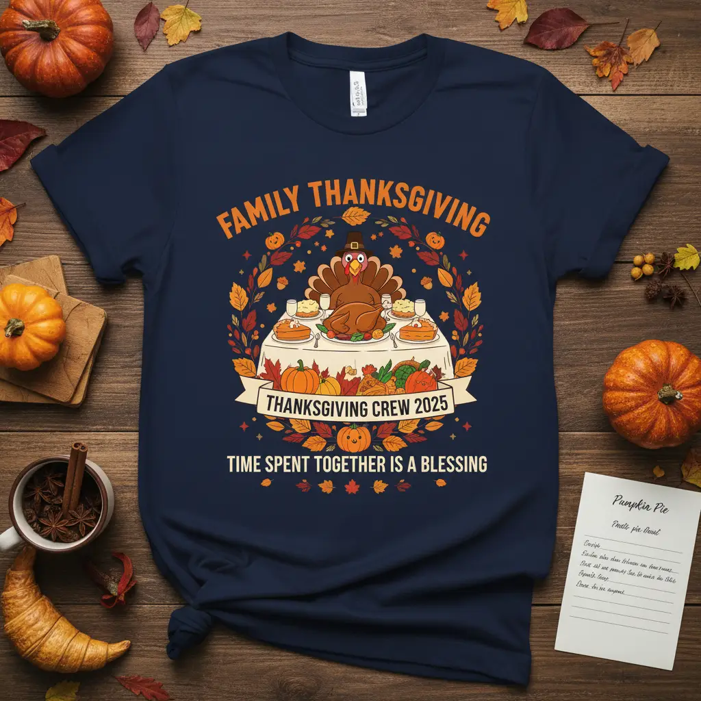 Finding the right outfit for Thanksgiving can be a joy, and this tee makes it simple and stylish. The phrase “FAMILY THANKSGIVING” at the top sets the scene immediately, while “THANKSGIVING CREW 2025” personalizes it for your specific family gathering. The entire design is crafted to be visually appealing and meaningful, reflecting the joy and warmth of the holiday.