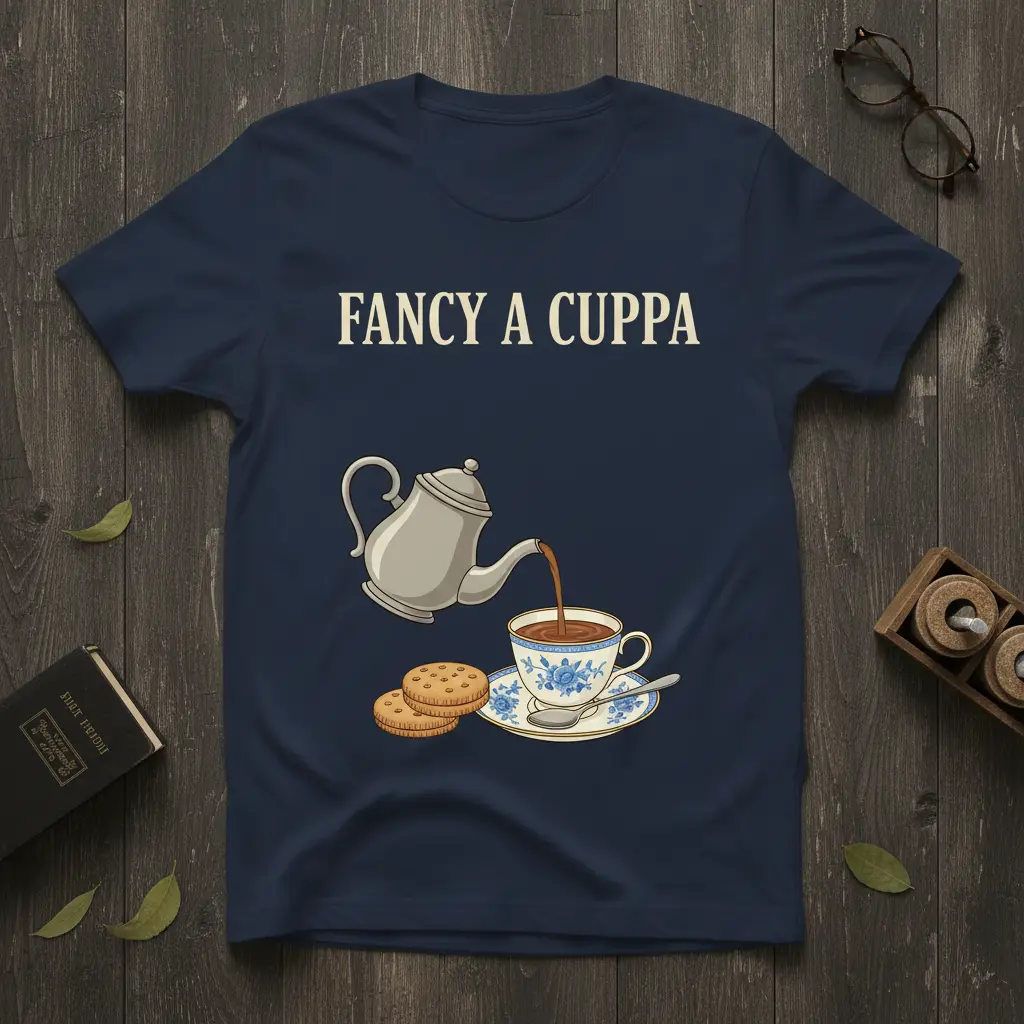 The “Fancy A Cuppa” t-shirt is designed for the discerning tea drinker, celebrating the ritual of enjoying a hot beverage. It features a delightful illustration that perfectly captures the essence of a cozy afternoon tea break. This shirt is an ideal way to express your love for tea culture and the comforting moments it brings.