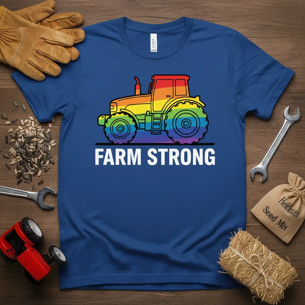 The message “FARM STRONG” resonates with the inherent toughness and perseverance of farmers. Combined with the universally recognized symbol of LGBTQ pride, this shirt stands for unity, support, and celebration. It’s an ideal garment for wearing to agricultural events, pride parades, or simply as a daily expression of who you are.