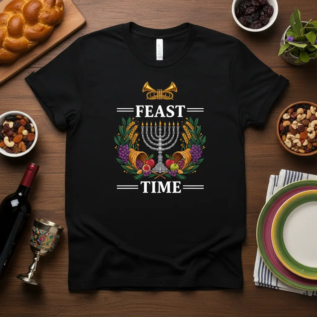 This eye-catching t-shirt is designed to be the perfect companion for all your Hanukkah festivities. The “Feast Time” slogan is prominently displayed, surrounded by a beautiful illustration that includes a traditional menorah, ripe grapes, fresh apples, and abundant cornucopias. These elements symbolize the richness and blessings of the holiday season, making it a meaningful piece of apparel.