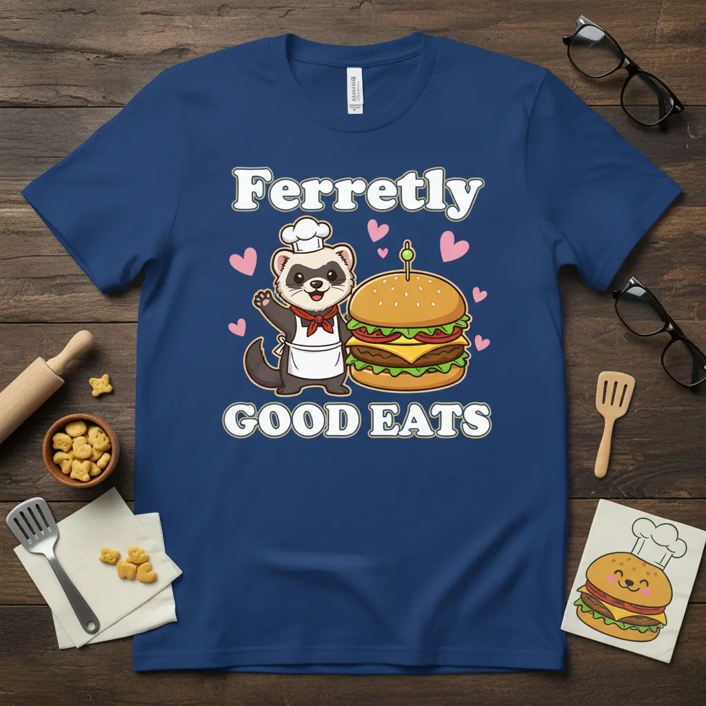 Embark on a delightful culinary journey with the Ferretly GOOD EATS t-shirt. This shirt brilliantly merges the cuteness of ferrets with the universal appeal of a classic burger. The design is meticulously crafted to appeal to both ferret enthusiasts and food lovers alike. It captures a fun, lighthearted moment, showcasing a ferret chef ready to serve up some deliciousness. This graphic is a testament to the joy that good food and cute pets bring into our lives.