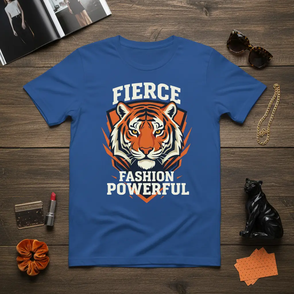 The design prominently features the words “FIERCE FASHION POWERFUL,” each word strategically placed to amplify its message. This powerful combination speaks to the wearer’s determination, sophisticated taste, and commanding presence. The bold, white lettering stands out against the vibrant colors of the tiger graphic, ensuring that the message is clear and impactful. This t-shirt is an excellent choice for individuals who want to wear their confidence and make a memorable impression.
