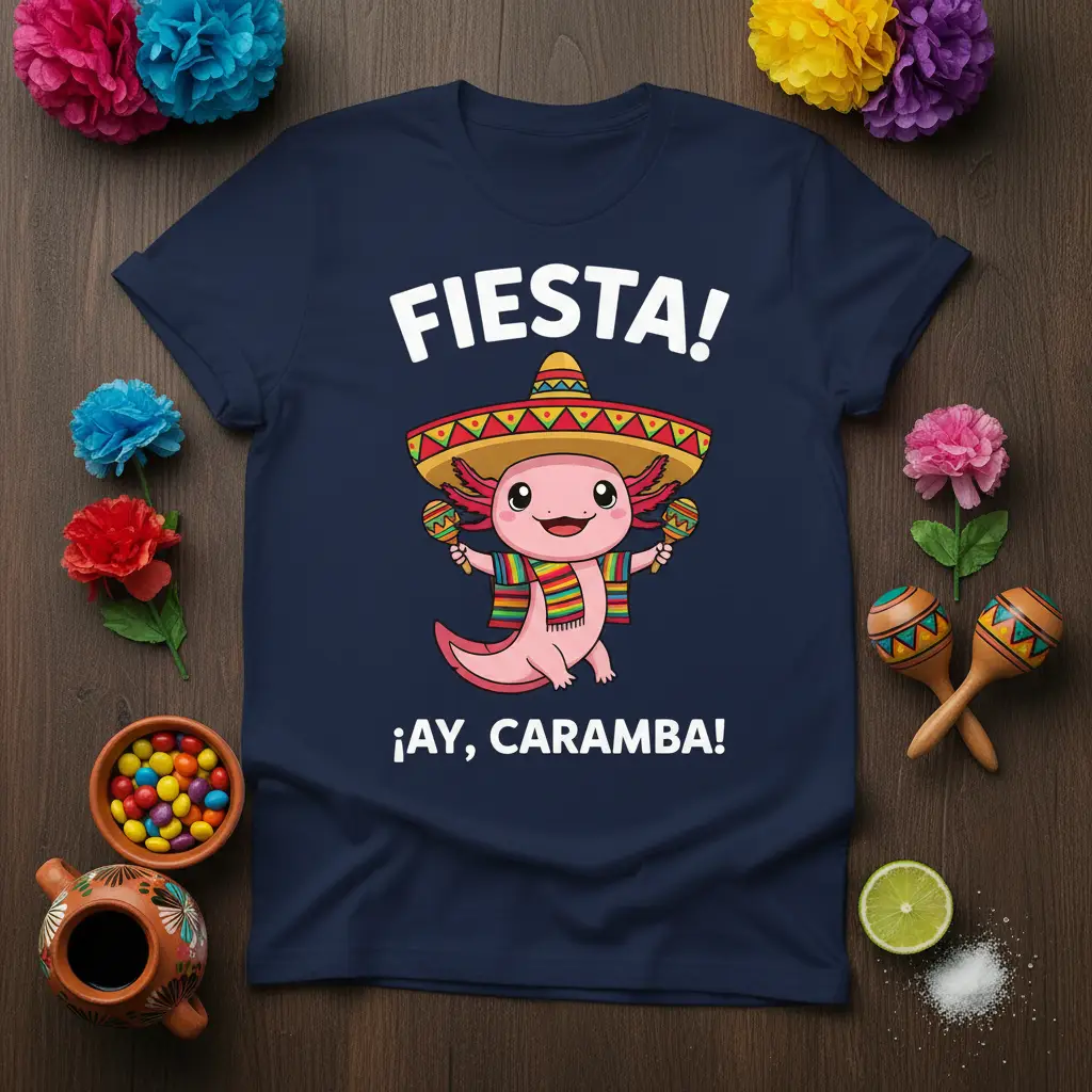 Embrace the spirit of celebration with our exclusive Fiesta! ¡AY, CARAMBA! t-shirt, designed for those who love to have a good time. The central graphic features an adorable axolotl, complete with a festive sombrero and colorful maracas, embodying the joyous essence of a fiesta. This shirt is a perfect way to express your love for Mexican culture, fun parties, and unique graphic apparel.