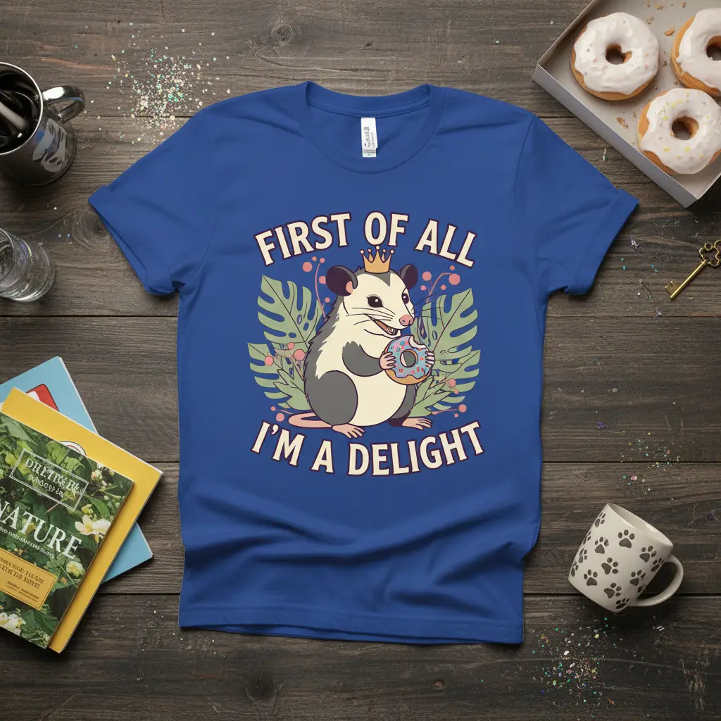 FIRST OF ALL I’M A DELIGHT – this is more than just a phrase; it’s an attitude, a statement, and a whole lot of charm packed onto a comfortable t-shirt. This unique graphic tee features an absolutely adorable opossum, complete with a tiny crown and a delicious donut, embodying the very essence of delight. It’s designed for those who appreciate the quirky, the funny, and the wonderfully unique aspects of life.