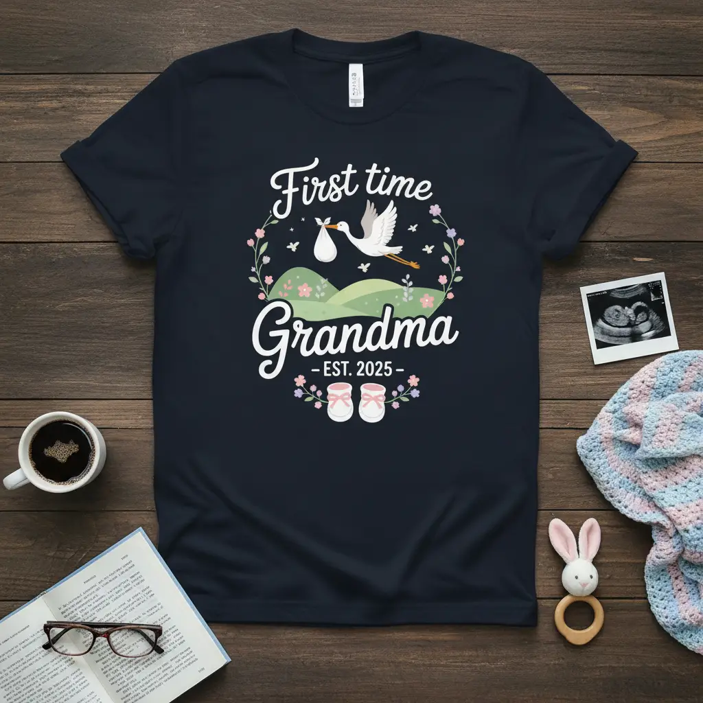 Pick from Black, Navy, Royal, Dark Heather, Red, and White to match your mood and wardrobe staples. Each colorway keeps the First time Grandma EST 2025 design clear and photo-ready for everyday wear.