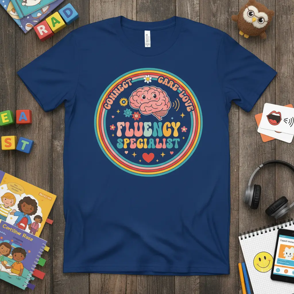 This retro-style t-shirt is designed for comfort and durability, making it ideal for long days in the clinic or classroom. The eye-catching graphic features “Fluency Specialist” prominently displayed, ensuring your role is recognized. The surrounding elements, like the playful stars and heart, add an extra layer of charm and warmth, reflecting the compassionate nature of speech therapy. It’s a thoughtful gift for any speech-language pathologist who goes above and beyond.