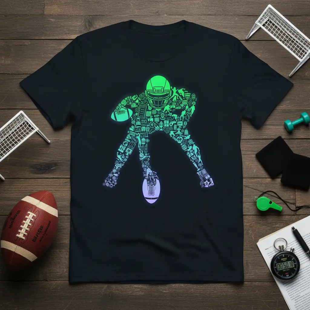 Unleash your inner athlete and showcase your passion for the gridiron with the **Football Player Icon Collage T-Shirt**. This isn’t just any t-shirt; it’s a wearable piece of art designed for the dedicated football fan. The intricate silhouette of a football player is meticulously crafted from a vibrant collage of numerous small icons, each representing different facets of the sport and athletic life. This unique design offers a fresh perspective on fan apparel, making it a standout choice for game days, casual wear, or as a thoughtful gift for the football enthusiast in your life.